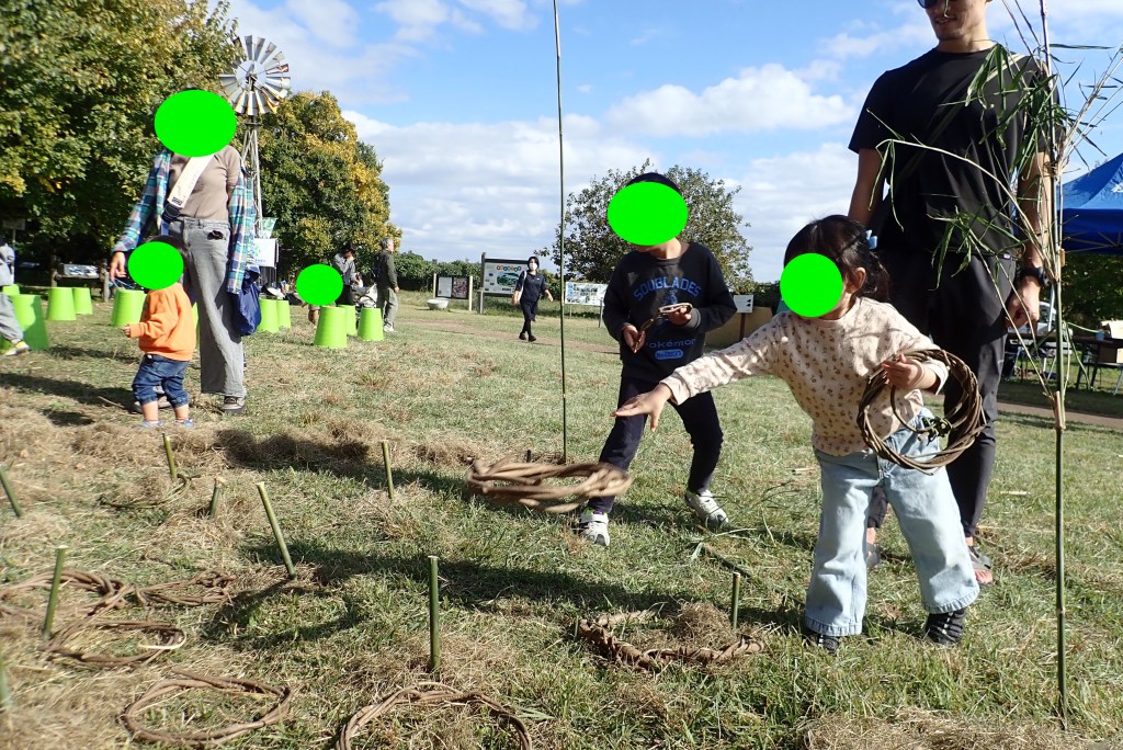 (写真2)クズのつるの輪投げや綱引き、ストラックアウトなど、野遊びが子供たちの心をつかみました。