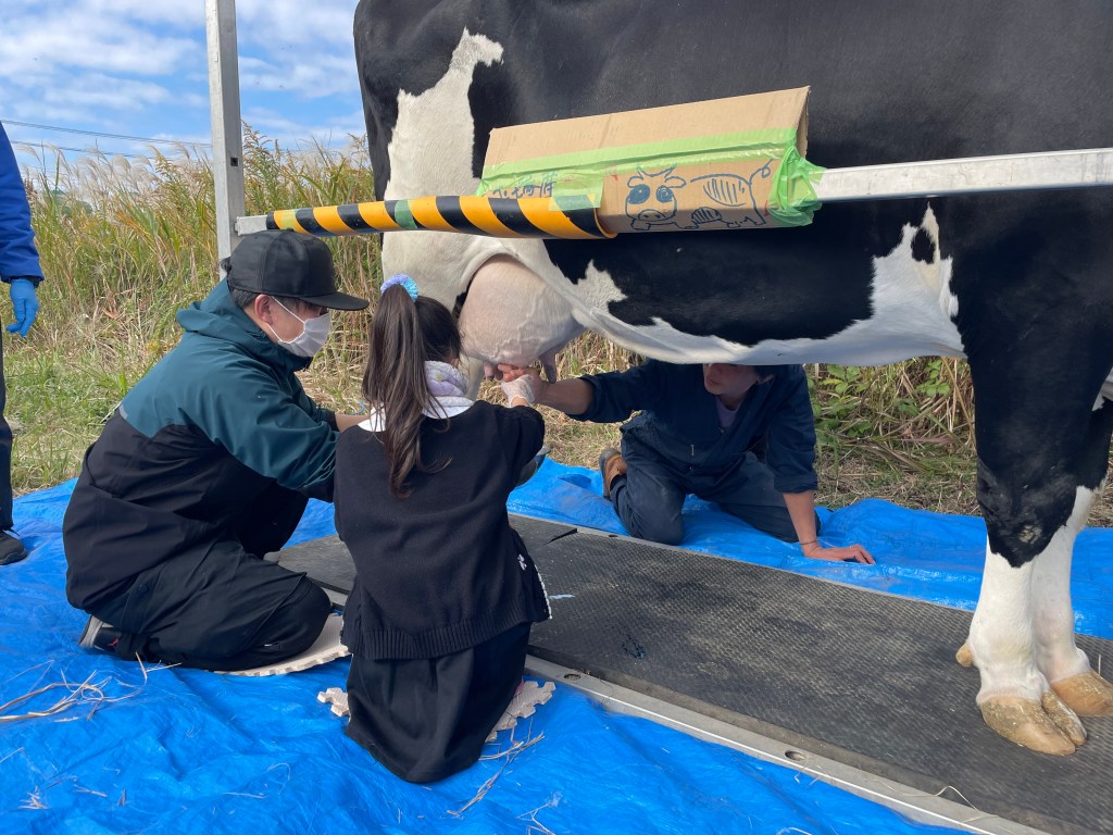平塚市内の若手酪農家からなる「角笛会」(内田明光会長)のご支援で搾乳体験を楽しみました。子どもたちの真剣な眼差しが印象的でした。