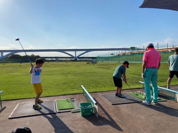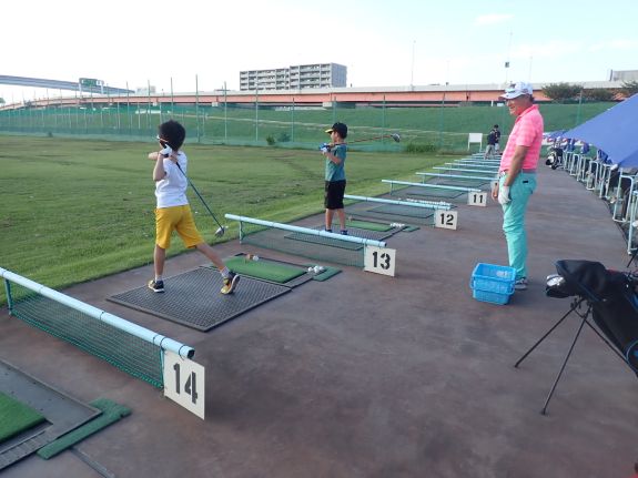 扇ゴルフ練習場にて、まずは始まりの挨拶からスタート。 初めてゴルフクラブを握る子も、経験者の子も、それぞれに合った的確なアドバイスをコーチから受けながら、後半には自信をもってスイングできるようになり、子どもたちの成長を感じる場面がたくさん見られました。